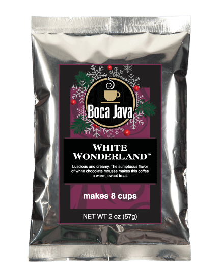 Luscious and creamy, the sumptuous flavor of white chocolate mousse makes this gourmet coffee a warm, sweet treat. Like a fine confection in a cup, this seasonal favorite is wonderfully rich and smooth. White Wonderland coffee has a base that's full-bodied and complex, and its dreamy, creamy flavor of white chocolate mousse is a pleasure on a cold winter's night. A holiday flavor all will enjoy! If you enjoy our White Wonderland flavored coffee, our roastmaster suggests you try our Frosty's Favorite specialty coffee.